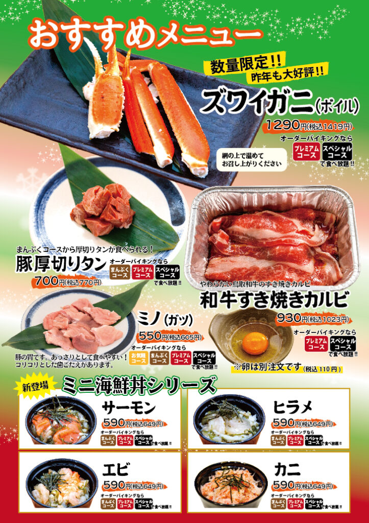 2025.12.03 Wed 米子店、雲山店 ◆冬のおすすめメニュー◆ この冬おすすめメニューのご紹介!! 今年もやります『ズワイガニ』!! 網であたためてお召し上がりください。 新登場★『ミニ海鮮丼各種』 お椀サイズのミニ海鮮丼です。 とってもやわらか『鳥取和牛すき焼きカルビ』 コリコリした歯ごたえのある『ミノ』 『豚厚切りタン』 オーダーバイキングらそれぞれ記載のコースで食べ放題! 単品でのご注文もできます。