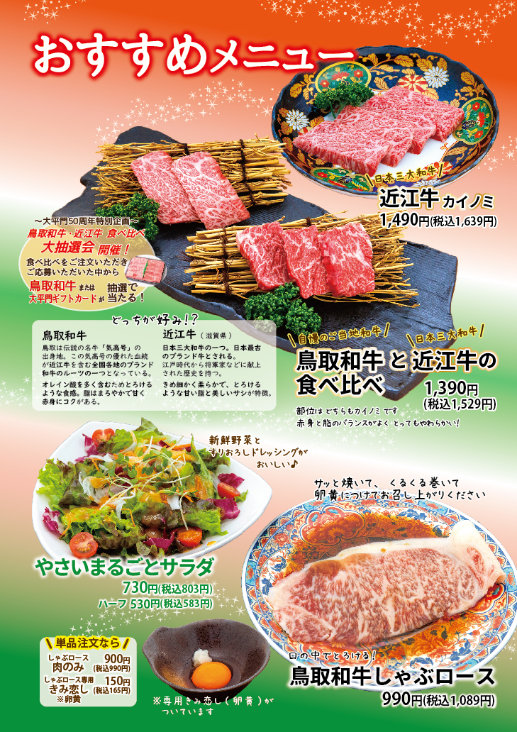 2025.12.03 Wed 倉吉本店、湖山店、田和山店 冬のおすすめメニュー始まりました🎄 今回のおすすめは、 『鳥取和牛と近江牛の食べ比べ』 鳥取和牛と近江牛、部位はどちらもカイノミです。 旨味ややわらかさなどに違いはあるのでしょうか。 食べ比べてみてください♪ ★こちらの商品をご注文いただいてご応募いただいた中から 抽選で、鳥取和牛すき焼き肉or大平門グループで使えるギフト券が当たる キャンペーンをしています🎊 『鳥取和牛しゃぶロース』 口の中でとろけるやわらかさ。脂の旨味も味わえます 『やさいまるごとサラダ』 新鮮野菜に、野菜をすりおろしたドレッシング。人気商品です!